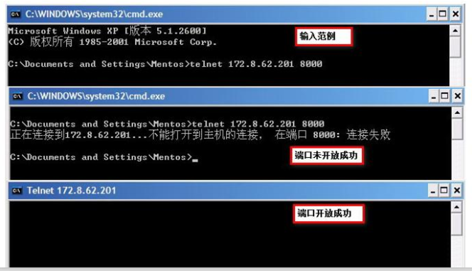 l 使用“telnet 域名 端口号”的方式测试端口是否开通(如果出现黑色界面,仅一个光标在闪,说明成功),否则则不成功。