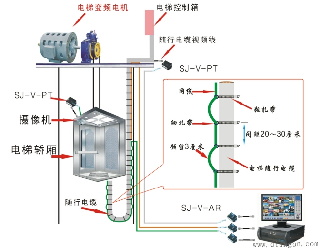 b.过去,在不明白原理的情况下,多数出线位置都是和其他随行电缆一起走,从电缆井的顶部或底部走出。这种情况下,考虑到只有一半电缆是随行运动的,另一半只是固定延伸连接,不运动,把这部分叫“不动电缆”。这就提供了一种可能,即一半随行运动电缆只能与其他随行电缆一起捆绑走线;而另一半不动电缆可以选择远离随行电缆单独走线的方法’在电梯井内把视频线紧贴井璧垂直走线,并把这部分电缆穿金属管或走金属槽,以屏蔽干扰对这部分电缆的影响,比较有效。无锡监控安装 无锡弱电工程 c.随行运动部分的视频电缆与其他随行电缆捆扎时,设计者应充分了解其他随行电缆的结构和分布情况,捆扎时视频电缆应尽量远离电流大、频率高的电缆,靠近电流小频率低的电缆捆扎。这里,哪怕有1cm的选择可能也要争取,因为干扰影响大小与距离的二次方成反比。无锡监控安装 无锡弱电工程 d.摄像机金属外壳,BNC头的外壳,同轴电缆的外导体等视频信号的“地”,和电梯轿厢、导轨等要绝缘,这在安装摄像机时要特别注意。无锡监控安装 无锡弱电工程 e.摄像机供电应优选集中直流供电方式,其次是选择轿厢照明电,不能用动力电。